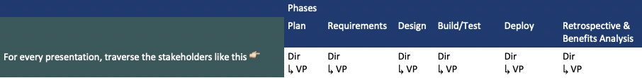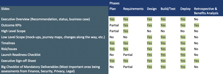 If you can imagine, any time we launch a new product or feature, we will have to make at least 6 executive presentations. One for each of plan, requirements, design, build/test, deploy, and review.